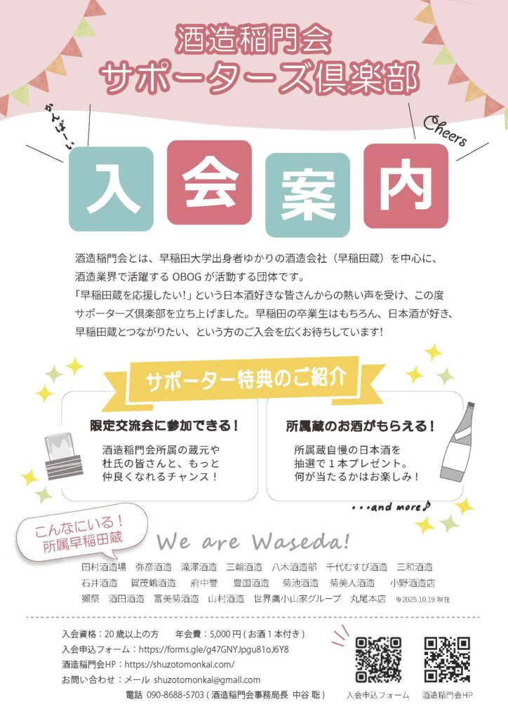 酒造稲門会では2025年10月、「早稲田蔵を応援したい!」という日本酒好きな皆さんからの熱い声を受け、サポーターズ倶楽部を創設しました。