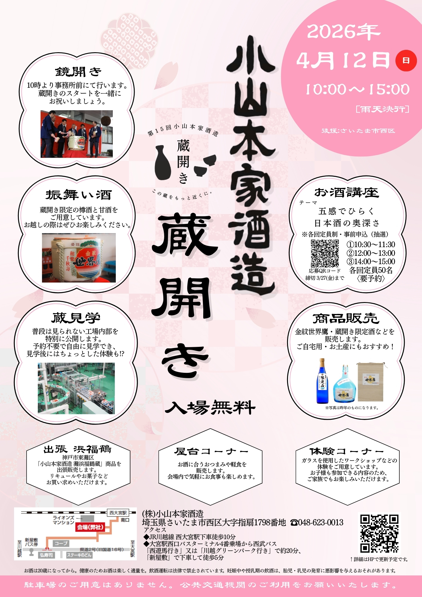 酒造稲門会会員 小山 紗友梨さんがお仕事をされている、世界鷹小山家グループ)の小山本家酒造(埼玉県さいたま市)が、2026年4月12日 (日)、「第15回 小山本家酒造 蔵開き」を開催します!